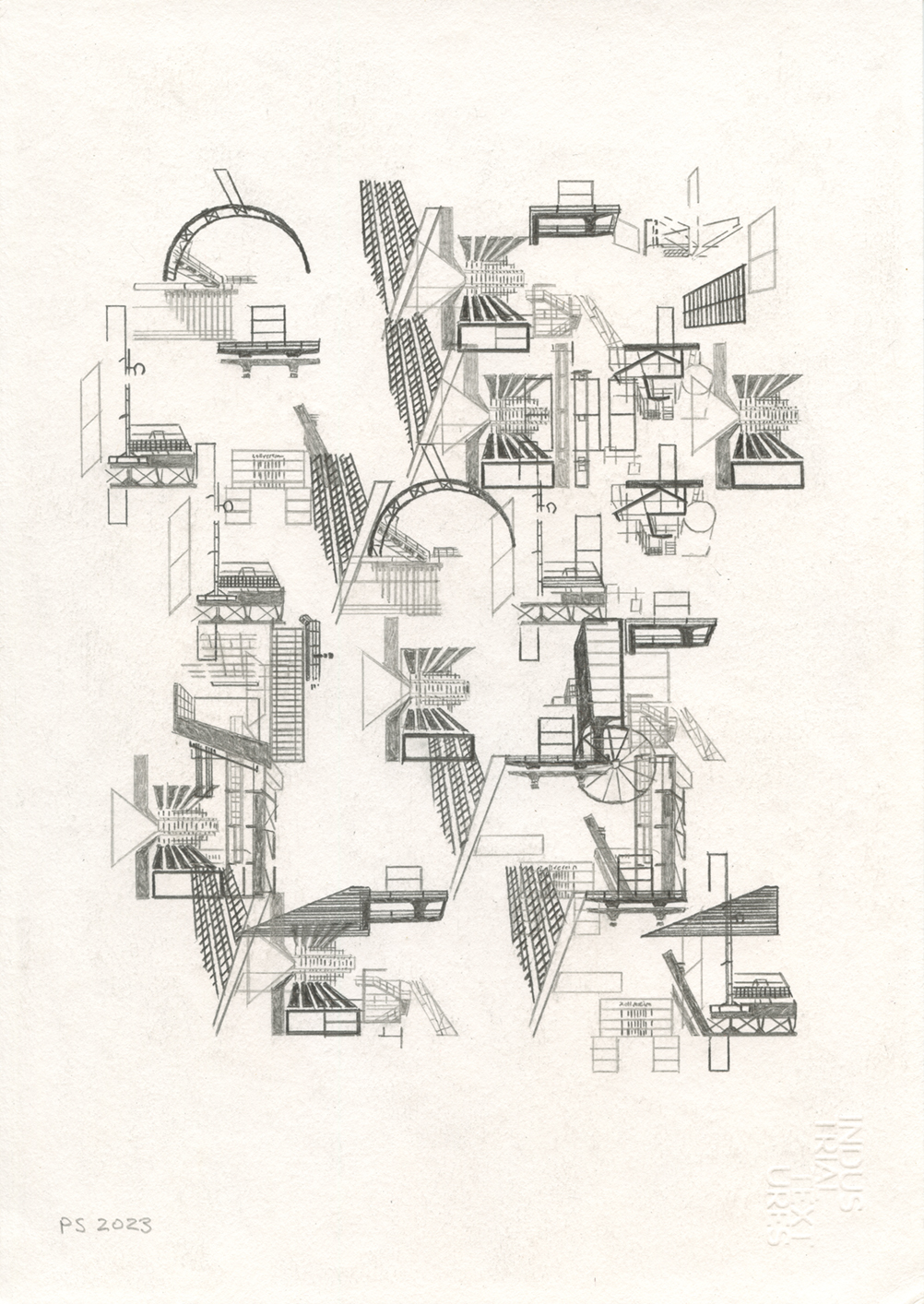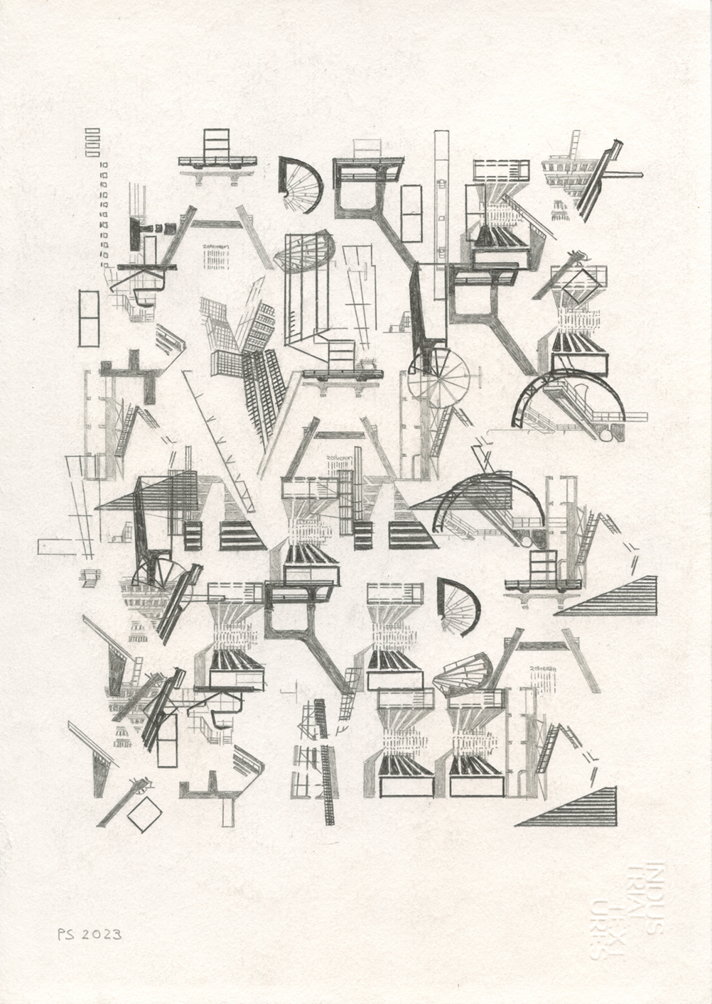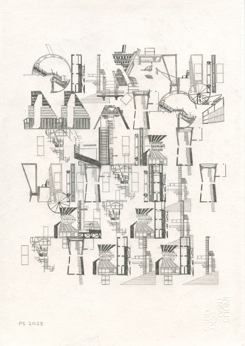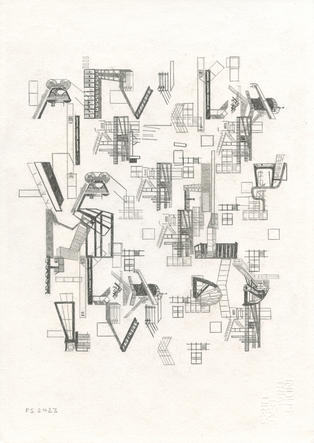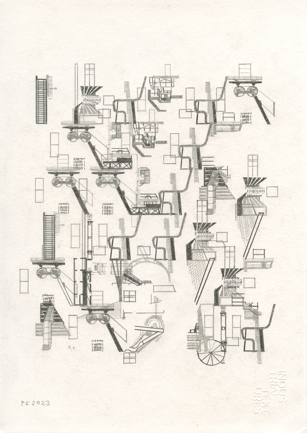 Series of six different pencil drawings, shown in this order from top to bottom. Incorporated into these are Essen Structures, layers 1–3. The quotes used are taken from the book Suttree by Cormac McCarthy. Drawing size: 29.7 x 21 cm. The price is €350 without frame and €375 including frame.